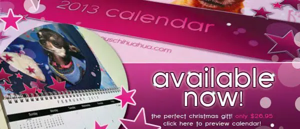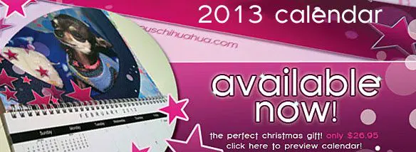 “the 2013 famous chihuahua® calendar is now on sale! featuring 12 of the cutest, most ‘fun, furry and fabulous’ chihuahuas on this planet! purchase yours today while this limited time only holiday sale lasts! ships internationally! prices may differ from country to country”